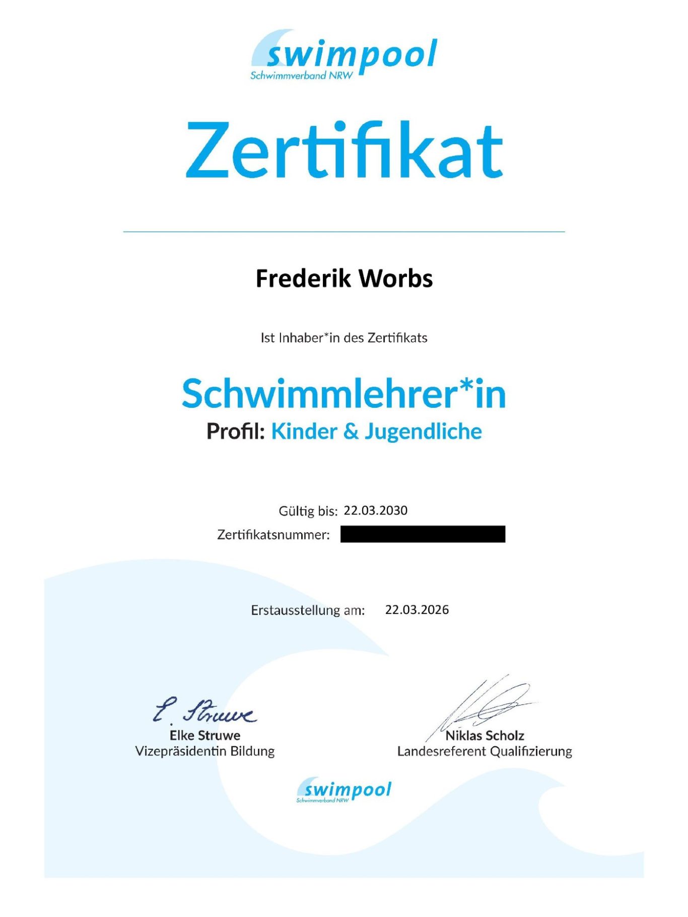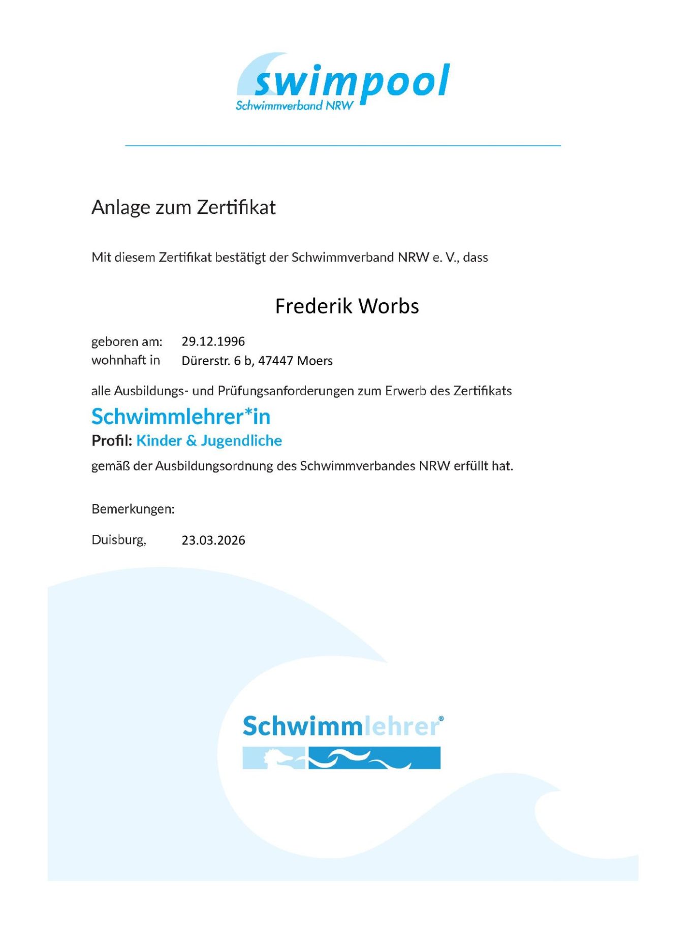 Im März 2026 wurde ich zertifizierter Schwimmlehrer für Kinder & Jugendliche durch den Schwimmverband NRW