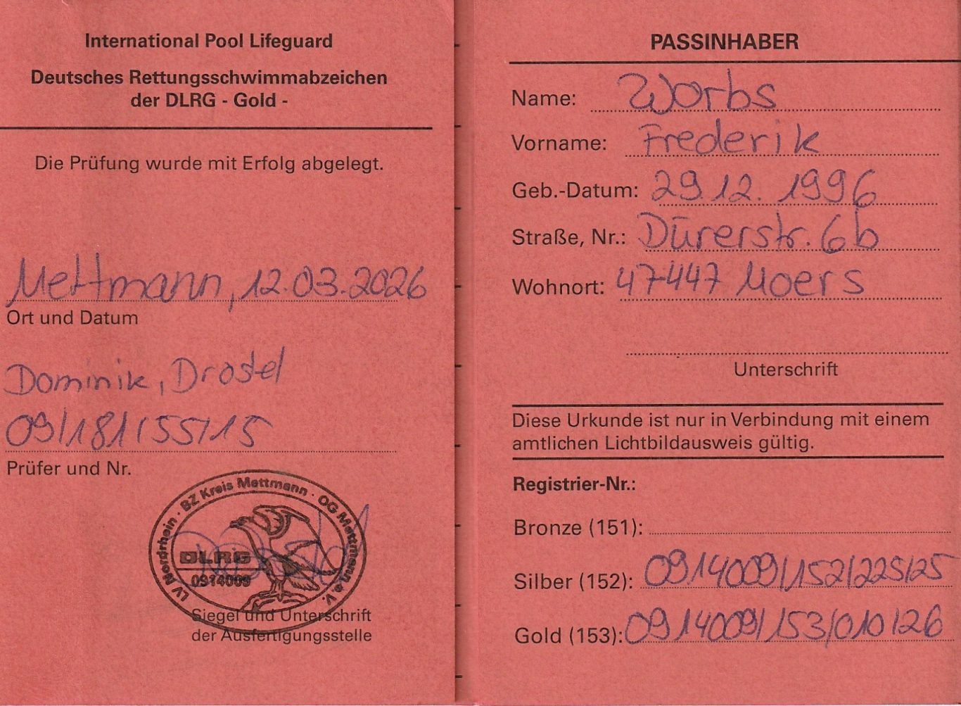 Im Mai 2025 legte ich dann erfolgreich die anspruchsvollste Deutsche Rettungsschwimmerprüfung in Gold (Life Guard Level 3) zuerst beim ASB in Münster ab und im März 2026 nochmals bei der DLRG in Mettmann, die den höchsten Rang bzw. die höchste Qualifikation eines Rettungsschwimmers darstellt. Erfahren Sie hier mehr zum DRSA Gold.