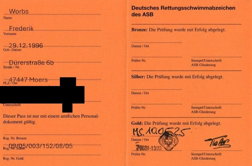 Da mit meiner Prüfer- bzw. Zertifikatsnummer in Verbindung mit meiner rechtsgültigen Unterschrift Schwimmprüfungen abgenommen bzw. Schwimmabzeichen ausgestellt werden dürfen wurde die Prüfernummer bzw. Zertifikatsnummer zum Schutz vor Missbrauch zensiert bzw. unkenntlich gemacht.